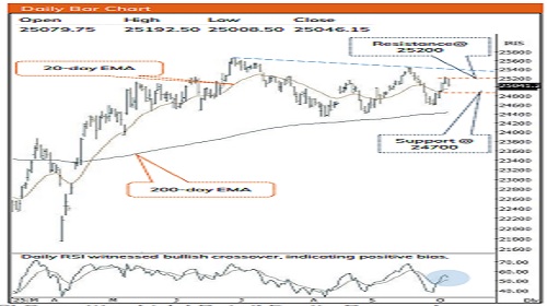 * Key point to highlight is that, Nifty failed to surpass 25200 level and witnessed negative market breadth which resulted in profit booking at higher levels as it closed below previous session low after 600 points of upmove, indicating pause in up move. Going ahead, index need to decisively close above 25200 for a meaningful pullback to materialize, else continuation of consolidation in 25200-24700 zone amid stock specific action can be expected ahead of Q2FY26 earning season. Strong support is placed at 24700 which is 80% retracement of the current upmove.
