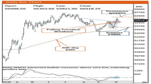 * Key point to highlight is that, index has breached below its prior session’s low after sixth consecutivee session of gains, indicating a short-term breather. However, the index continues to trade above key moving average and its previous gap support (55700), suggesting that the current decline is a healthy consolidation within an ongoing uptrend. As index likely to oscillate within the 55600-56800 band in the near term. A decisive breakout above 56800 would confirm the continuation of the uptrend, paving the way for a retest of its all-time high 57600. Therefore, any dip from current levels should be seen as a buying opportunity, with immediate support placed near 54,600, representing the 80% retracement of the ongoing up move (54,226-56,164).