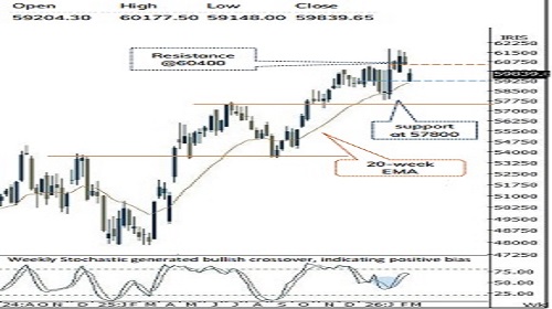 * Index began the week with gap-down opening and thereafter formed lower high lower low. However, last hour buying helped Index to recover some lost ground. Consequently, daily price action formed a bull candle, with gap-area above its high (60177-60438)indicating buying demand from lower levels.