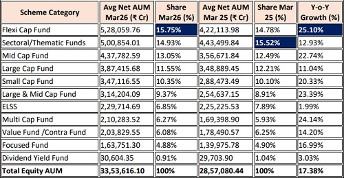 Flexi Cap Funds emerged as the largest and fastest-growing category within equity-oriented schemes, with average net AUM rising sharply to ~ Rs.5.28 lakh crore in March 2026, compared to Rs.4.22 lakh crore a year back, registering a 25.10% year-on-year growth