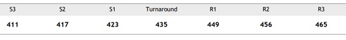 Upward momentum may prevail. However, a slip below 435 may initiate corrective dips.