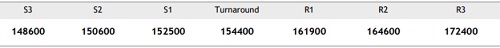 Upward momentum expected to prevail. Slip below 154400 may trigger weakness.