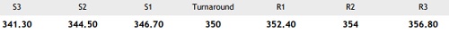Prices may stretch northward trades. Slip below 346.70 may signal corrective dips