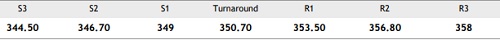 Prices may stretch northward trades. Slip below 350.70 may signal corrective dips.