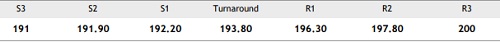 Range bound trades with mild positive bias expected. Slip below 193.80 could trigger weakness.
