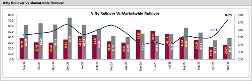 Bank Nifty Rollover: The Bank Nifty November rollover is at 26.3% on Thursday, which is a decrease from the 32.7% seen on the same day last month. Furthermore, this current activity is meaningfully below its three-month average of 31.3% and its six-month average of 33.6%. The significantly lower carry-forward rate for the banking benchmark, both sequentially and against historical data, signals a clear reduction in conviction and a cautious outlook within the financial sector derivatives, suggesting greater position-unwinding or profit-booking.