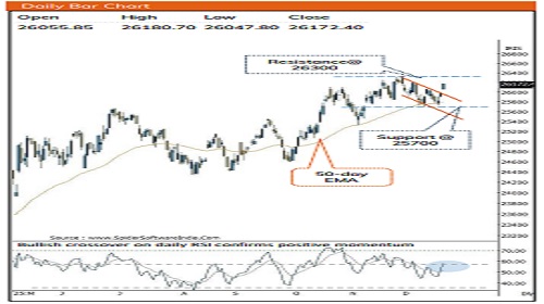 * The breakaway gap with falling channel breakout confirms resumption of uptrend that snapped three weeks corrective phase. We expect Nifty to challenge All Time High around 26300 and eventually pave the way to head towards 26700 in the coming month.