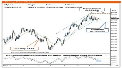 * The Breakout from three weeks falling trendline confirms resumption of uptrend that makes us believe Index would challenge upper band of consolidation at 60100 in coming weeks and thereafter head towards 60500 levels in coming months.