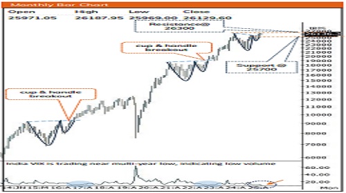 * Notably, the index retraced nearly 80% of its preceding four-day decline in a single session, coupled with a sharp rebound from the rising trendline, highlighting an accelerated pace of recovery. Going ahead, we expect the index to gradually challenge the 26,300 mark and open the door for 26800 in the coming week, being measured target of the current consolidation range (25700-26300).