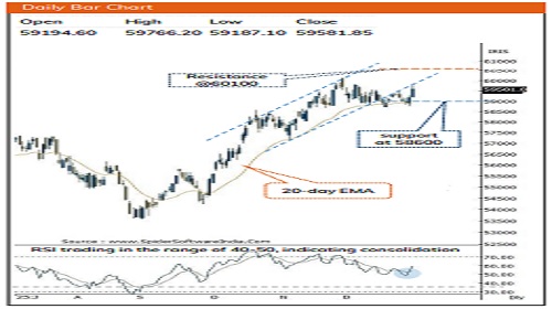* Key point to note is that, Index has finally managed to breakout from the recent consolidation range (58,500- 59,500), indicating resumption of uptrend. Going ahead we expect index to resolve higher and head towards all-time high near 60,100 in coming sessions.