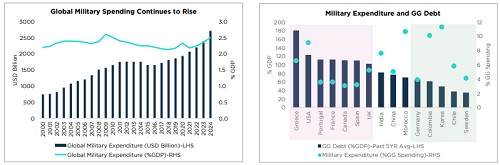 * Greece, the U.S., France, Italy, Spain, the UK, and Canada face limited fiscal space for increased military spending due to already elevated debt levels. China’s official debt figures exclude augmented liabilities, potentially understating fiscal constraints.