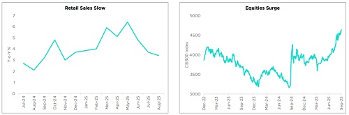 * Retail sales growth fell to 3.4% Y-o-Y in August, marking a third consecutive monthly decline. The support from the consumer goods trade-in program appears to be fading, while prolonged property sector stress and a weak labor market are weighing on consumer confidence and spending.