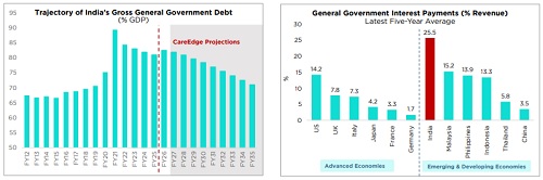 * While India’s government debt is projected to moderate, the elevated interest payments (% revenue receipts) are expected to remain a challenge.