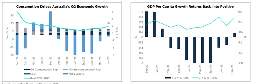 * Australia’s GDP accelerated to 1.8% Y-o-Y (0.6% Q-o-Q) in Q2 2025, up from 1.4% Y-o-Y (0.3% Q-o-Q) in Q1, driven by a 2% rebound in household consumption (vs 0.8% in Q1) and narrowing of the net exports' deficit.
