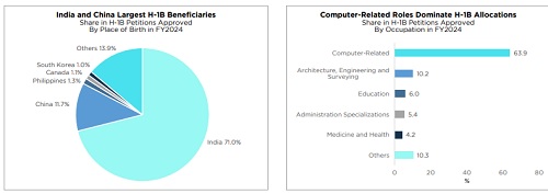 * H-1B visas, widely used by technology firms, primarily benefit Indian and Chinese workers, with a total of 3,99,395 visa petitions approved in FY2024.