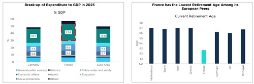 * France has a very high social spending as compared to its EU peers at about 23% of GDP, of which about 14.7% is attributed towards pension spending.