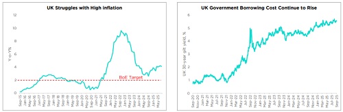* UK government bond yields are rising as persistent inflation and growing fiscal deficits erode investor confidence, prompting higher risk premiums.