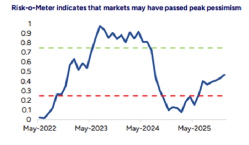 Market sentiment indicators suggest that the worst of pessimism may be behind us. Internal sentiment and risk metrics point to a gradual improvement from recent cycle troughs, supported by resilient domestic macro data and an improving earnings outlook. Notably, the high–low beta spread turning positive towards the latter part of 2025 indicates early signs of risk appetite returning, although the recovery is expected to be measured rather than linear.