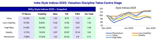 This consolidation was also evident across major equity style factors. Value and High Beta strategies posted positive returns in 2025, while Momentum underperformed, highlighting a market driven more by selectivity than by sustained trends. Value stocks drew investor interest due to compelling valuations and stable earnings visibility, serving as a preferred refuge amid elevated volatility. High Beta strategies delivered modest gains, indicating calibrated risk-taking rather than a broad risk-on stance. Meanwhile, repeated trend reversals limited the effectiveness of momentum-based approaches, reflecting narrow market breadth and fragmented leadership. Overall, investor behaviour in 2025 leaned toward caution, with capital favouring stocks that combined valuation support with controlled risk. The style factor landscape in 2025 was defined by the strong performance of contrasting factors, driven largely by sector- and stock-specific moves. Market breadth remained narrow and momentum was weak, reinforcing a selective and low-risk appetite investing environment.