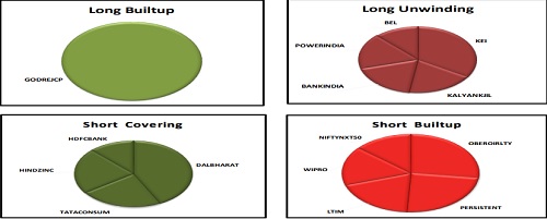 The above second chart shows previous trading day’s change in Nifty options where Liquidations in OI were seen in 26000, 25900, 25800, 25700, 25600 strike Calls and at 25500, 25400, 25300, 25200, 25000 strike Puts indicating market is likely to remain range bound in the near term.