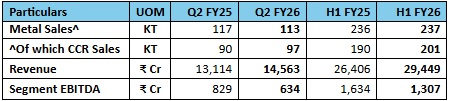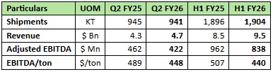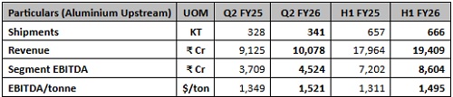 Downstream achieved a record EBITDA of Rs.261 crore, up 69% compared to Q2 FY25. Despite headwinds, Novelis reported flat shipments over the prior year quarter.