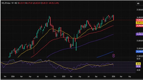 Immediate resistance lies at 25,800, followed by 25,940 and 26,000, while support is placed at 25,600 and 25,450. A breakdown below 25,300 may intensify downside pressure. A cautious approach remains suitable, with strict stop-loss discipline amid ongoing volatility.