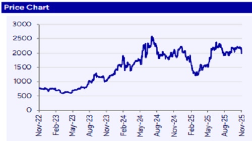 We revised our FY27/FY28E EPS estimates by -7.6%/-4.7% factoring in slower execution pace and supply chain issues. BEML reported a muted Q2FY26 performance, with revenue declining 2.4% YoY to Rs8.4bn and EBITDA margin remaining stable YoY at 8.7%. Despite execution headwinds, the company maintained a robust order book of Rs163.4bn, supported by sustained momentum in private and public capex across mining, railways, and defense. Order inflows stood at Rs27bn in Q2FY26, driven by a Rs18.9bn order from the Integral Coach Factory under railways and ~Rs6bn order for HMVs from the defense segment Export contribution is expected to improve to ~4% in FY26 (vs ~1% in FY25) alongside a rising defense mix (~30% in FY26 vs 27% in FY25), which should aid margin recovery over time. However, CFO weakened sharply to -Rs2.4bn as of H1FY26 (vs +Rs1.8bn as of FY25), exerting pressure on the balance sheet. While the medium-term outlook remains healthy, near-term growth visibility is constrained by slower project ramp-up and supply chain bottlenecks. The stock is currently trading at a PE of 30.1x/24.6x on FY27/28E. We roll forward to Sep’27E and maintain our ‘Hold’ rating on stock with a TP of Rs1,982 (Rs2071 earlier) valuing the stock at a PE of 27xSep’27E (29x Mar’27E earlier).