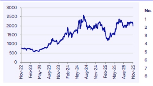 We revised our FY27/FY28E EPS estimates by -7.6%/-4.7% factoring in slower execution pace and supply chain issues. BEML reported a muted Q2FY26 performance, with revenue declining 2.4% YoY to Rs8.4bn and EBITDA margin remaining stable YoY at 8.7%. Despite execution headwinds, the company maintained a robust order book of Rs163.4bn, supported by sustained momentum in private and public capex across mining, railways, and defense. Order inflows stood at Rs27bn in Q2FY26, driven by a Rs18.9bn order from the Integral Coach Factory under railways and ~Rs6bn order for HMVs from the defense segment Export contribution is expected to improve to ~4% in FY26 (vs ~1% in FY25) alongside a rising defense mix (~30% in FY26 vs 27% in FY25), which should aid margin recovery over time. However, CFO weakened sharply to -Rs2.4bn as of H1FY26 (vs +Rs1.8bn as of FY25), exerting pressure on the balance sheet. While the medium-term outlook remains healthy, near-term growth visibility is constrained by slower project ramp-up and supply chain bottlenecks. The stock is currently trading at a PE of 30.1x/24.6x on FY27/28E. We roll forward to Sep’27E and maintain our ‘Hold’ rating on stock with a TP of Rs1,982 (Rs2071 earlier) valuing the stock at a PE of 27xSep’27E (29x Mar’27E earlier).