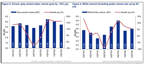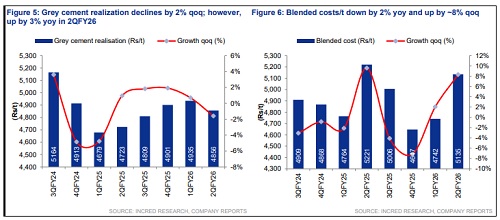 JK Cement or JKCE’s 2QFY26 grey cement volume grew by ~15% yoy to 5.01mt, with the overall volume being ~7% above expectation, and outperformance in South and Central India. In its core markets, JKCE grew in mid-to-high teens. North India was flattish, at industry growth rate. JKCE reiterated its FY26F grey cement volume guidance of 20mtpa (+10% yoy). The focus is to grow better than industry (7-8%) in FY26F, while maintaining profitability. Saifco’s branding and distribution ramp-up positions it to tap into the ~4mtpa regional market, bridging access to non-trade projects where local players lack scale. Grey cement realisation fell by ~2% qoq due to seasonal weakness and GST rate cut. As per JKCE, post-GST rate cut, some visible pressure on prices was observed across markets.