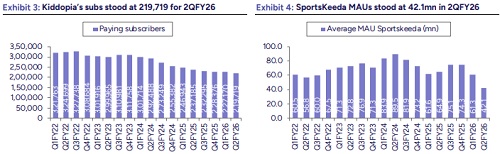 Con-call highlights: 1) 90%+ of gaming revenue comes from international markets, with strong presence in US and UK. 2) Key initiatives to strengthen the IP-led mobile portfolio includes launching Love Island Season 13, preparing Animal Jam for Roblox debut, and releasing Big Boss, India. 3) Curve Games delivered strong performance, with Human Fall Flat selling 1.25mn units in Sep’25 (+25% YoY) and Wobbly Life crossing 2mn lifetime units, while work continues over Switch 2 version. 4) Smaaash 2.0 revamp is currently underway with relaunch targeted for FY27E. 5) 3 new Funky Monkeys centres were opened in 2QFY26 with an aim to scale the count from ~14–15 centres currently to ~100 in the coming years. 6) SportsKeeda cut costs by 13% YoY in 2QFY26 and targets a further 40% reduction in 3QFY26E. 7) SportsKeeda remains the largest contributor within ASPL, accounting for ~85% of revenue and ~90% of EBITDA. 8) Core gaming business is expected to deliver 20–25% YoY growth while EBITDA margins are expected to be in the 20–25% range in the foreseeable future. 9) Nazara’s total investment in Freaks4U amounts to ~$40mn, comprising the initial $9mn for a 13.5% stake (Jan’24), a $25mn stock-swap transaction that increased ownership to 57%, and an additional $6.5–7mn in primary cash infusion