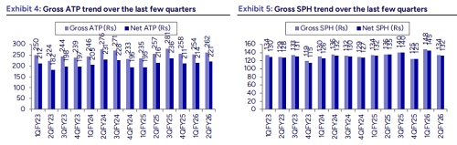 Top-line increased 12.4% YoY: Top line increased 12.4% YoY to Rs18,230mn (PLe Rs18,272mn). Movies like Saiyaara, Coolie, Mahavatar Narsimha, War 2, They Call Him OG, Lokah: Chapter 1, Jurassic World: Rebirth, Jolly LLB 3, Su from So, Mirai, Hari Hara Hera Mallu, and The Conjuring: Last Rites have aided topline. Footfalls increased 14.7% YoY to 44.5mn (PLe 44.0mn) while occupancy stood at 28.7% in 2QFY26. Gross ATP increased 1.9% YoY to Rs262 (PLe of Rs262) while gross F&B SPH declined marginally by 1.5% YoY to Rs134 (PLe of Rs135).