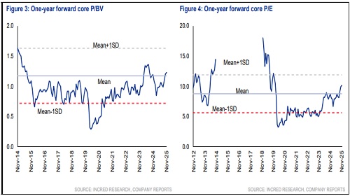 Headline margin increased by 7bp QoQ to 2.97% while loan spread declined by ~5bp QoQ. Domestic yields declined by 20bp QoQ and were partly offset by lower domestic funding costs, down 16bp QoQ. We note that loan spreads have bottomed out and will gradually inch up over the next few quarters. That said, the pace of margin progression hinges on incremental disbursement margin/MCLR cuts, given that SBI lags large private peers. Moreover, 3QFY26F margin could be impacted by the drag from lumpy borrowing towards end-Sep 2025. Management gave margin guidance of 3% over the next few quarters while we expect FY26F margin at 2.95% and build in broadly steady margin for FY27F.