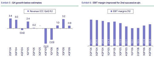 Operating Margin: Margin improvement continued for the second consecutive quarter, with EBIT margin expanding by 140 bps QoQ, following a 240 bps improvement in Q3. Margins improved despite a ~90 bps headwind from wage hikes (wef from Jan. 1), supported by tailwinds from INR depreciation (~155 bps), operational efficiencies (~65 bps), and improved utilization. For FY26, the company reported an adjusted EBIT margin of ~20%, down 330 bps YoY.