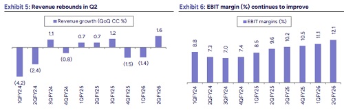 The revenue growth (+1.6% CC QoQ) exceeded our estimates (+0.5% CC QoQ), margins also outperformed our estimates by ~50bps in Q2. The revenue performance in Q2 saw steady recovery after two consecutive quarters of negative growth (in CC). The growth was dominated by selective pockets and clients, while Communications vertical de-grew 2.0% QoQ, implies Telcos under stress. Manufacturing reported solid growth (+5.1% QoQ), however the Automotive outlook remains bleak, especially on the commercial side. The deal TCV remains elevated in Q2 is a positive and a testament of putting efforts to scale “Must Have” accounts. The early signs are visible in scaling the high potential accounts (at least 17) to USD1m+, while pruning the tail and onboarding potential logos would be continued exercise going forward. On margins, we believe the cost optimization efforts would continue at a similar pace of FY25/FY26 with continued efforts to rationalize employee pyramid and leveraging project Fortius. We are baking in revenue growth of flat/+4.1%/5.2% CC YoY with margin improvement of 190bps/250bps/30bps YoY in FY26E/FY27E/FY28E. We roll forward to Sep’27 and assign 19x to arrive at a TP of Rs. 1,500. The stock is currently trading at 26x/20x FY26E/FY27E EPS, leaving no potential upside. Retain, HOLD.