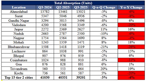 Eight out of the fifteen cities saw YoY decline in sales with Bhubaneshwar witnessing the maximum decline at 26%. Trivandrum saw the maximum rise in sales at19% in Q3 2025.