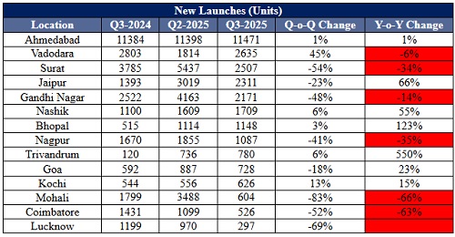 Bhubaneshwar saw the maximum decline in new launches at 88% in Q3 2025. Eight out of fifteen cities saw a decline in new launches.
