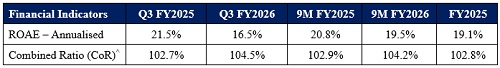* Excluding the impact of CAT losses of Rs.0.84 billion in 9M FY2026 and Rs.0.94 billion in 9M FY2025, the Combined ratio on 1/n basis was 103.7% and 102.9% respectively.