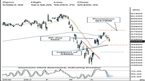 * Key point to highlight is that over last five session index has failed to sustain at higher levels, indicating near term correction. Lack of follow through strength indicate continuation of corrective phase wherein strong support placed around 54600,being 38.2% retracement of entire April rally (49954-57456). Further, a decisive close above previous session high (56138) would be required to pause the ongoing decline.