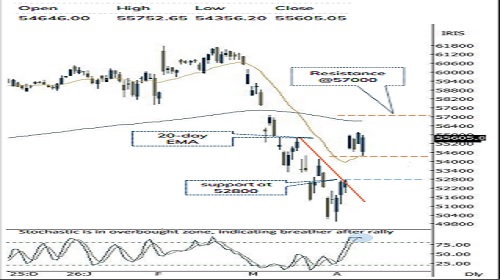 * Index is likely to witness a gap up opening tracking firm global cues amid positive development on geopolitical conflicts that resulting into decline in crude oil prices. Key point to highlight is that, index rebounded after taking support at short term 20-day EMA and 38.2% retracement of current up move(51950-55970) indicating inherent strength. We believe the current fall is a part healthy consolidation that will further improve the structure for the next leg of up move towards 5700 in the coming weeks. Hence, any decline from current levels should be used as buy on dips strategy as strong support is placed at 52800, as it is confluence of Gaparea (52800-54800)and 50% retracement of March-April decline (55554-49954). Wherein focus should be on accumulating quality stock backed by strong Q4 earning.
