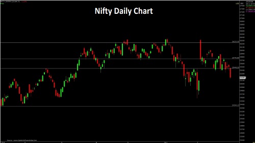 Nifty opened with a downward gap and selling pressure throughout the session dragged it lower to end negative . Nifty closed at 25179withaloss of 318 points. On the daily chart the index has formed a long Bearish candle forming lower High-Low compare to previous sessionindicatingnegative bias. The chart pattern suggests that if Nifty breaks and sustains below 25140 level it would witness selling which wouldleadtheindextowards 25100-25000 levels. However, if index crosses above 25250 level it would witness pullback rally which would take the indextowards25350-25400