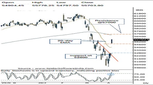 * Key highlight is that, index has seen faster pace of retracement as 8 session entire decline got retraced in past 4 days, highlighting structural turnaround that bode well for trend reversal. We expect, BankNifty to resolve higher and head towards 57000 levels in the coming weeks. The current sharp recovery makes us revised our support at 52800 as it is confluence of Gap –area (52800-54800)and 50% retracement of March-April decline (55554-49954).