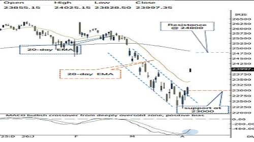 * The index has fulfilled all the prerequisites for confirmation of conclusion of corrective bias as index has closed above its last week’s high and sustaining well above its short-term moving average. Further, faster pace of retracement, where 8 sessions decline got entirely retraced in just 4 sessions, highlighting structural turnaround that bode well for trend reversal. We expect, Nifty to resolve higher and head towards 24800 in the coming weeks as it is confluence of 200 days EMA coincided with 61.8% retracement of Feb-April decline (26341-22182).