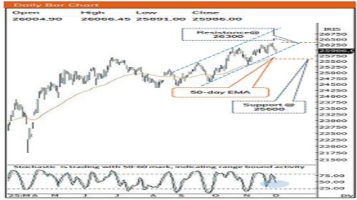 * The Index opened on a flat note and drifted gradually lower in early trade and then remained range-bound for most of the session. A late rebound in the last half hour helped trim losses, and the index eventually settled above its 20-day EMA (25968). As a result, daily price action formed a small bear candle with wicks on both ends, indicating near term consolidation phase.