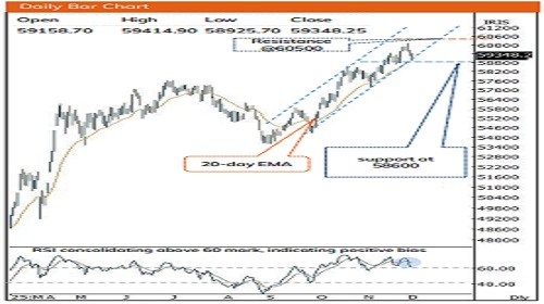 * Key point to highlight is that, past ten weeks price action has been captured in a well-defined rising channel. In last session, supportive efforts from lower band of rising channel helped index to maintained the sequence of higher high-low formation. Hence, follow through strength along with a decisive close above previous session high would confirm resumption of uptrend that would help index to challenge the All Time High and head towards 60500 in coming weeks. Hence, traders should adopt buy-on-dips approach in fundamentally strong banking names, particularly those that delivered robust Q2 earnings as immediate support is placed near 58,600, which also coincides with the 50% retracement of the recent upmove from (57157-60114)