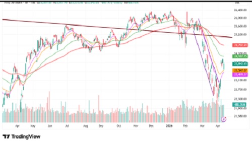 The index opened on a gap-down note but witnessed a strong recovery during the session, moving higher to test the prior day’s low and eventually marking an intraday high around 23,907. On the daily scale, the index found support near its 26 DEMA, a key short-term average, indicating a neutral-to-positive undertone in the near term. On the sectoral front, Defence and CPSE indices emerged as top gainers, while Oil & Gas and FMCG sectors underperformed during the session