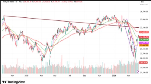 The index opened on a positive note but gradually drifted lower during the session, testing the 50-DEMA and witnessing some profit booking. Despite the intraday weakness, the index continues to sustain above the 40-hour EMA, indicating that the near-term trend remains positive. On the sectoral front, Defence and Metals emerged as the top gainers, while PSU Banks ended marginally lower.