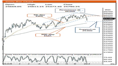 * Index has staged a strong rebound from the 50% retracement of its prior sharp up-move(24605-26325) a level that also aligned with 100-day EMA, reinforcing significance of this support zone. Going ahead, holding above Monday’s panic low of 25473 would keep pullback options open. Failure to do so would lead to extended correction wherein strong support is placed at 25300. A decisive close above the previous session’s high would confirm resumption of uptrend and head towards millstone of 26100.