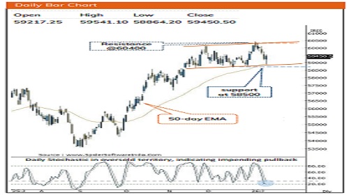 * In line with our view Index rebounded from the lower band of the rising channel coinciding with 50-day EMA, indicating strong support base. Going ahead, a follow through strength above previous session high would indicate resumption of up move and resolve higher towards 60400.