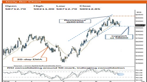 * Over past 3 weeks index has retraced 50% of preceding rally (57158-60114)indicating healthy consolidation. Absence of decisive close above previous session high has resulted into prolonged consolidation. Hence, for a meaningful pullback to materialize, index need to decisively close above previous session high, which would help index to pause current corrective phase and gradually resolve higher to challenge its all-time high 60100.