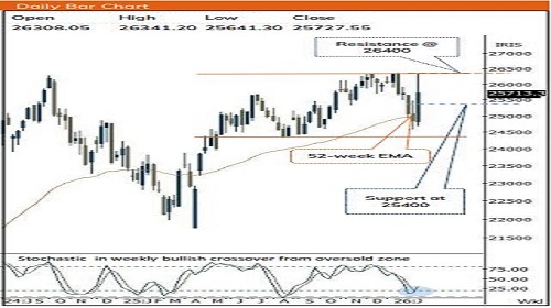 * Key point to highlight is that the entire decline of the previous fourweeks was retraced within a single session, indicating a faster pace of retracement, which has witnessed for the first time in the past one and a half years, indicating a sign of a structural trend reversal. With momentum continuing to strengthen, the index is well-positioned to gradually retest its all-time high of 26,350 in the coming weeks. On the downside, the 25,000-25,200 zone is expected to evolve into a strong demand area, as it coincides with the 80% retracement of the recent up-move (24,571-26,341) and 200-day EMA. Consequently, any pullback from current levels should be viewed as a buy-on-dips opportunity, with strong support firmly placed around the 25,000 mark.